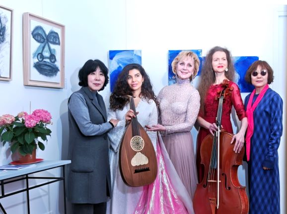 The inauguration of the exhibition Beyond Borders unfolded in two luminous moments—on March 10 and March 17—each graced by the exceptional performance of Laure Volpato (cello) and Marjan Ravandi (oud). Their ensemble, Duo D Âmes de Cœur, enchanted audiences with a dialogue of classical and traditional music, interwoven with poetry readings that deepened the resonance of the artworks on display.