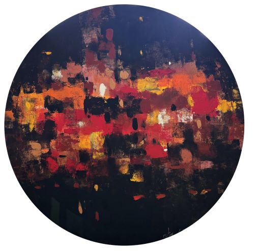 Thejomaye Menon, Chennai-based visual artist and art educator, has spent over three decades shaping the language of contemporary Indian art. Rooted in her Kerala heritage, her practice has long explored the intricacies of human relationships, gradually evolving into pure abstraction. Her works invite viewers to engage with texture, space, and the raw essence of art itself, moving beyond representation into a deeper dialogue with form and canvas. Widely exhibited in India and abroad, she has held a solo show at Jehangir Art Gallery, Mumbai, and received the International Award for Contemporary Painting in France in 2006.