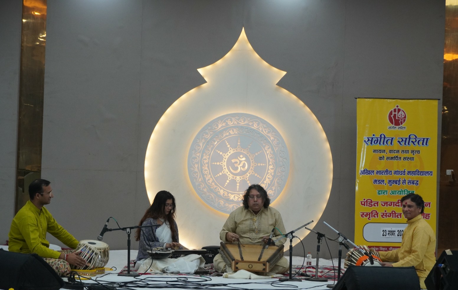 The evening opened with a warm chorus by the young voices of Sangeet Sarita, guided by Guru Rajendra Kumar Sharma of the Akhil Bhartiya Gandharv Mahavidyalaya Mandal. The lamp was lit, guests were honoured, and soon Smt. Shashwathi Chavan’s gentle notes in Raga Yaman and Bhairavi Abhang set a serene mood.