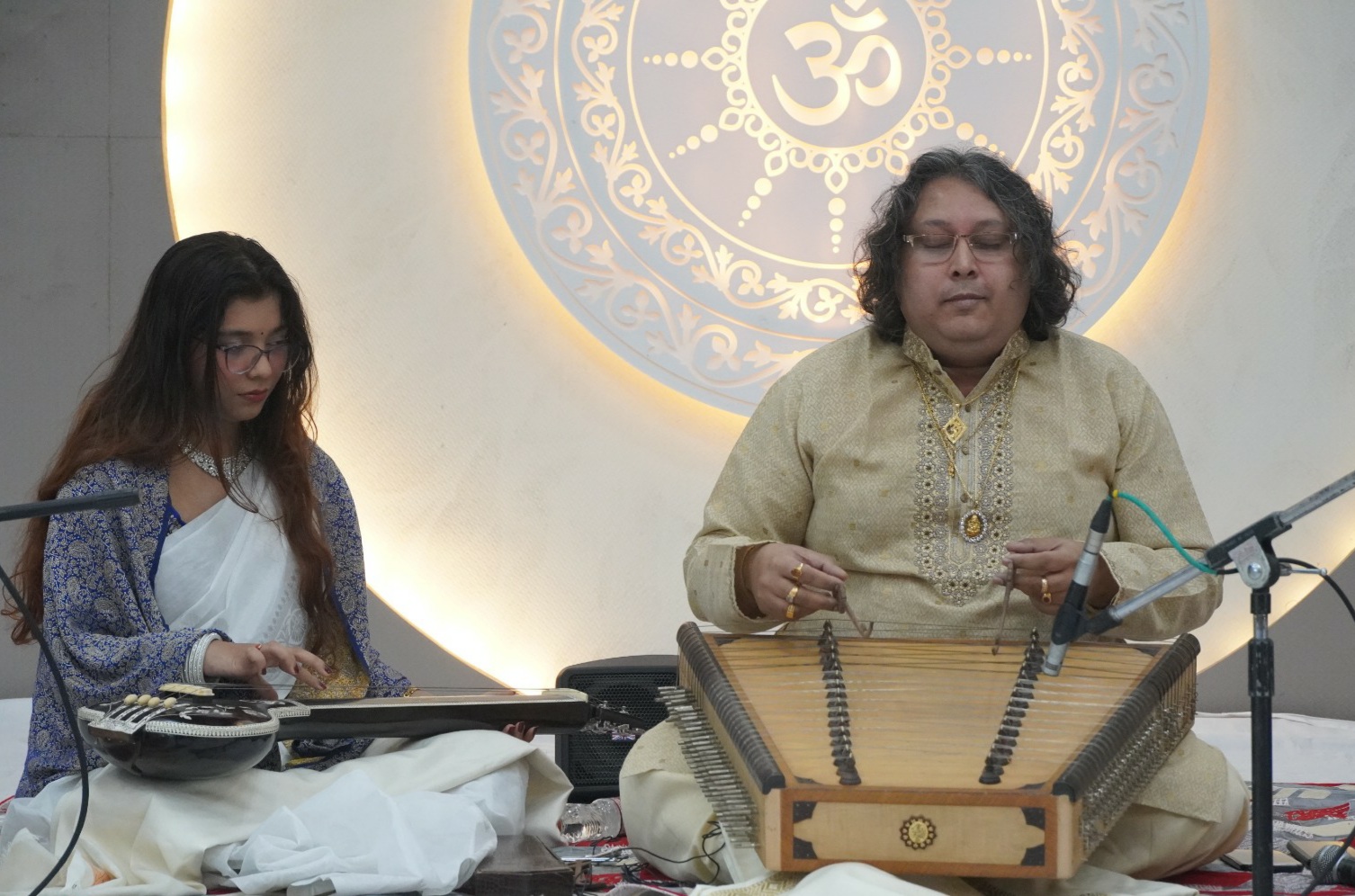 Pandit Dishari, rooted in the Senia Maihar tradition yet self-taught on the rare Shatatantri Veena, unfolded his art with originality. His recital began with Raga Bageshri in the Senia Dhrupad-style Alaap–Jor–Jhala, joined by Pandit Manmohan Nayak on pakhawaj. The meditative alaap, the shimmering veena tones, and the rare Ulti Jhala held the hall in quiet wonder, as dignitaries and maestros including eminent dignitaries such as Pandit Vijay Shanker Mishra (renowned musicologist & chief guest) Dr. Tapaswini Pradhan (oncology surgeon & special guest) Ustad Amjad Khan, Pandit Sudhakar Chavan, listened in rapture.