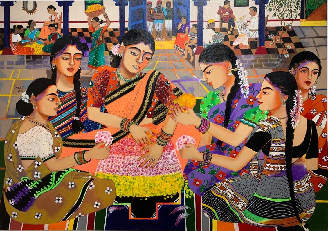 Her paintings—rooted in Telangana’s soul—breathe with quiet strength, where women bloom like white flowers against warm earth.