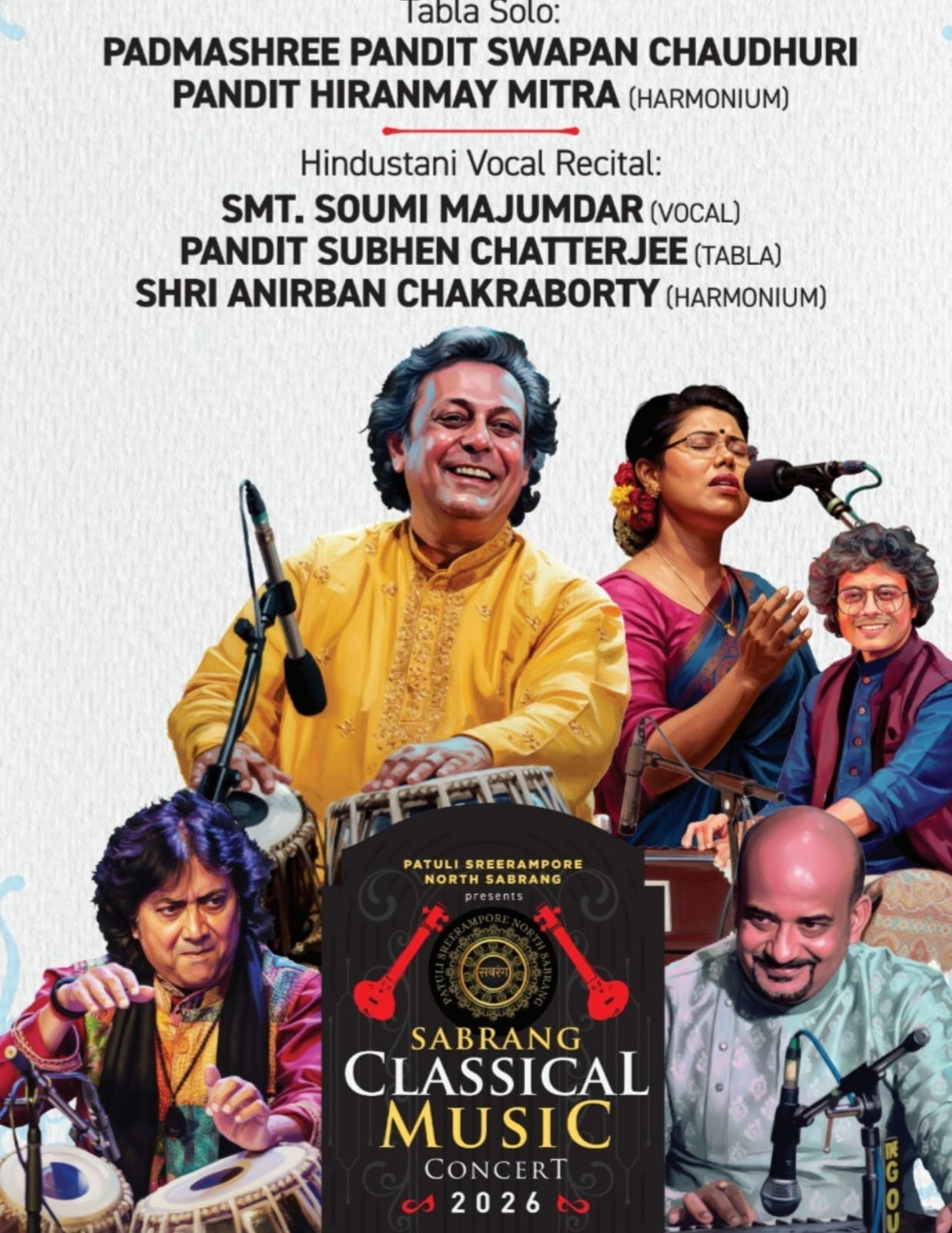 PATULI SREERAMPORE NORTH SABRANG stands devoted to nurturing and celebrating the rich heritage of Indian Classical Music, while honouring the timeless legacy of Ustad Bade Ghulam Ali Khan Sahab. Carrying this vision forward, the organisation will present the Sabrang Classical Music Concert on 16 January 2026 — an evening that brings together internationally acclaimed maestros, eminent stalwarts, distinguished artists, and gifted young talents.