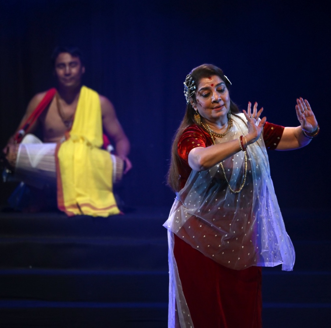Keeping with the theme of unity in diversity, Priti Patel brought together the dance forms of Bharatnatyam, Kathak, Odissi, Manipuri Rasleela, Manipuri Sankirtana, and Thang Ta. Flowing and intertwining, these movements created exquisite patterns — a living reflection of Vasudhaiva Kutumbakam, the timeless philosophy that celebrates harmony within diversity.