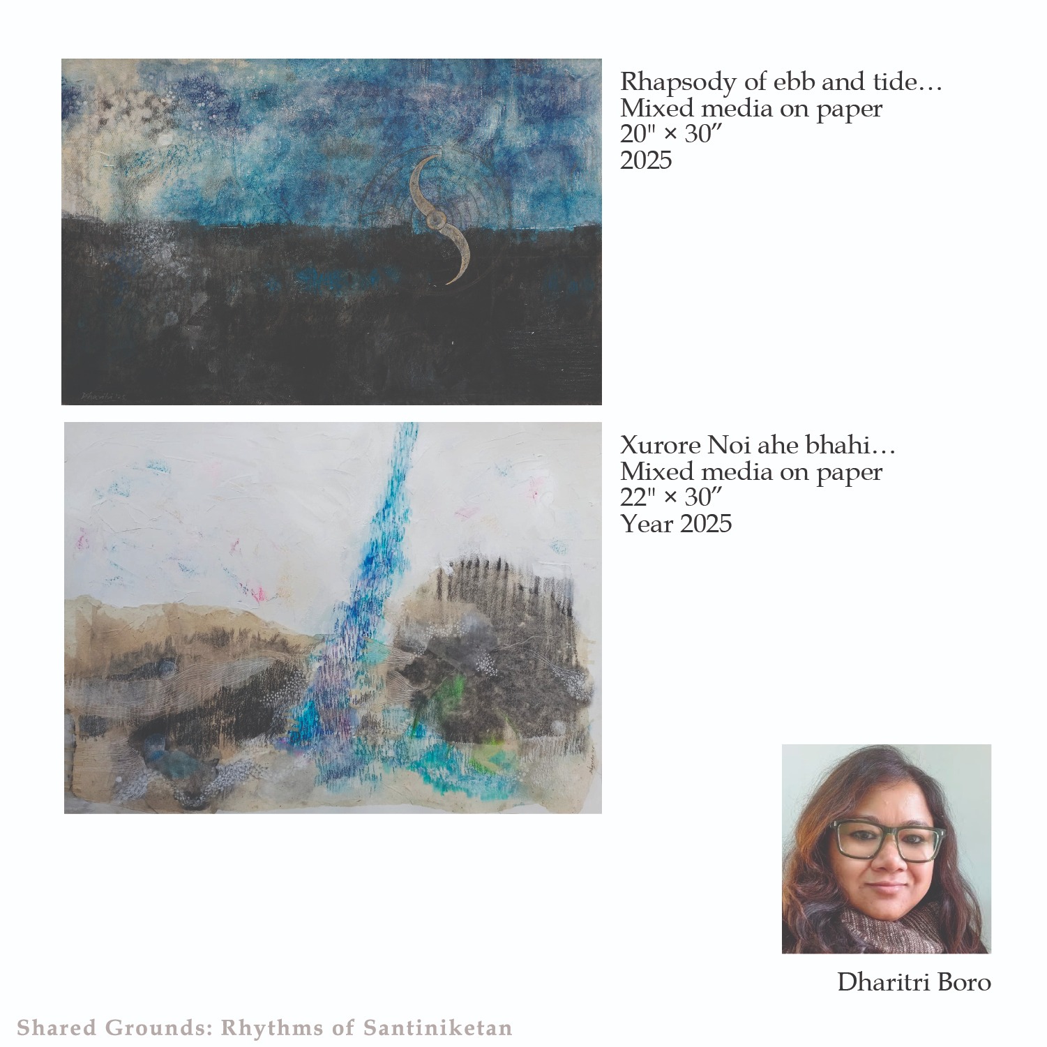 From the lyrical strokes of Ajit Seal and Alpana Dawn Seal to the evocative forms shaped by Ambarish Nandan and Amit Kumar Dhara, Shared Grounds: Rhythms of Santiniketan gathers a constellation of creators whose practices span geographies, generations and genres. Atanu Pramanik, Bani Biswas, Dharitri Boro, and Dr. Archana Das bring forth nuanced reflections of material and memory, while Dr. Bhavna Khajuria Basumatary, the curator herself, joins the ensemble with her own artistic voice. The exhibition resonates with the layered expressions of Dr. Janak Jhankar Narzary, Dr. Nirmalendu Das, Falguni Mukherjee, Kumar Jasakiya, and Lawnshaibha Kharmawlong—each contributing to the rhythm of this collective journey. M. Thomas Singh, Nanda D Mukherjee, Pooja Panchal, and Prabir Kumar Biswas lend their distinct textures to the dialogue, alongside Rajarshi Biswas, Rima Kundu, and Rishav Gandhar Narzary. Completing this vibrant chorus are Sandip Baul, Shrabani Roy, Sk. Sahajahan, and Tapashi Rani Ghosh—artists whose works echo with inquiry, transformation and shared resonance.