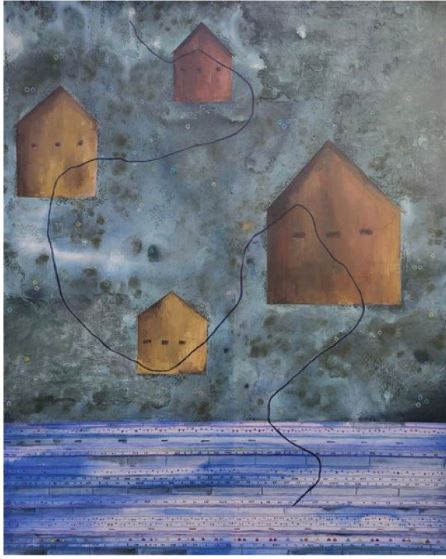 Recurring motifs of floating houses and suspended structures whisper of memory and distance, holding within them the fragile balance between presence and absence.