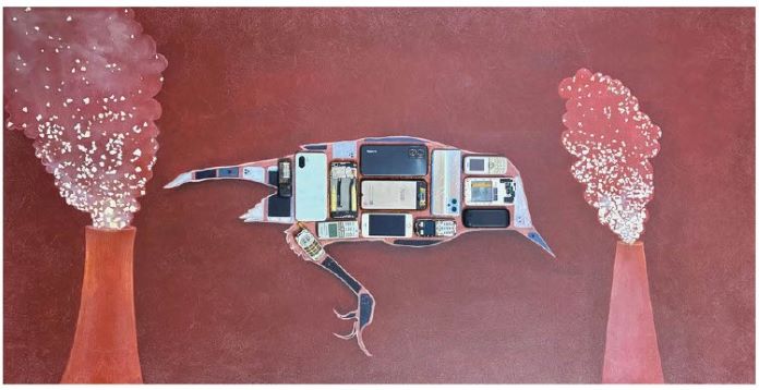 A striking highlight of the exhibition is a mixed-media bird crafted from discarded mobile phones, symbolizing the tension between hyperconnectivity and emotional overload.