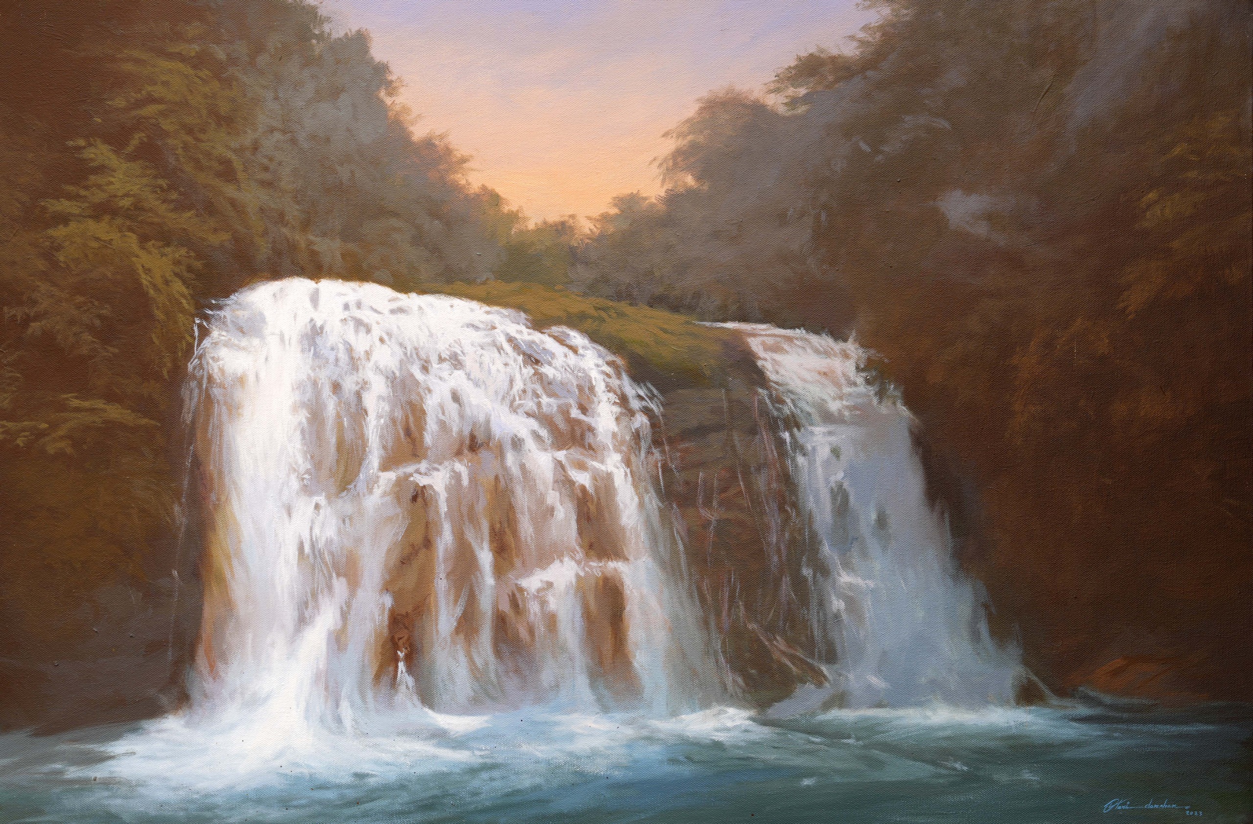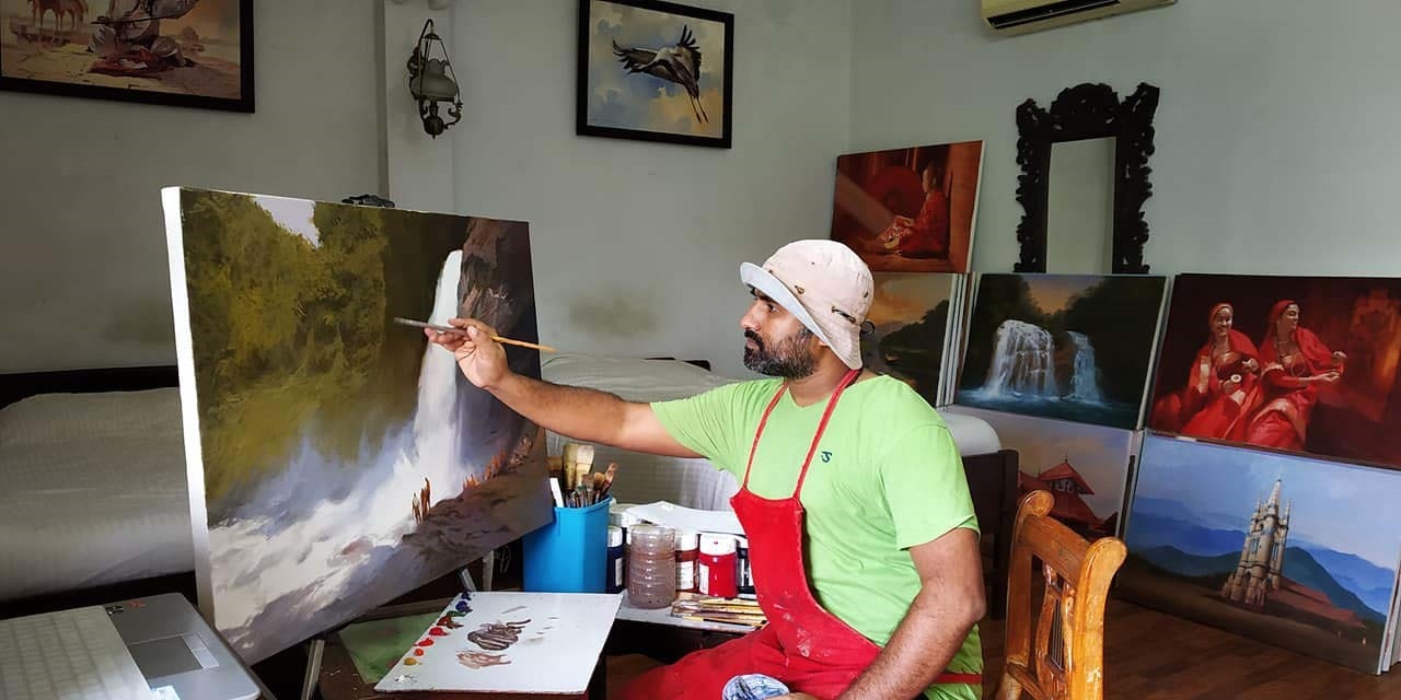Renowned for his deep sensitivity to nature, Hari Darshan Sankhya’s painting of Abbey Falls is awe-inspiring. The rush of water, the scent of soil, and the play of light all come alive, as his brush gives voice to the raw power of nature.