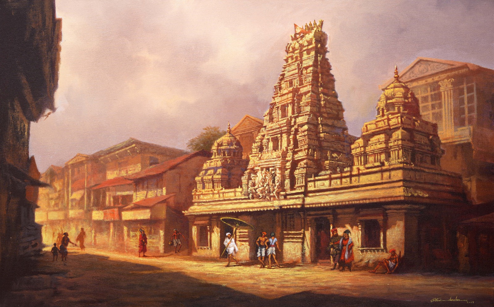In “Sri Ganesh Temple, Virajpet”, the artist reveals how devotion and daily life flow together in rural India. The temple’s gopuram glows softly at dawn and dusk, while villagers in traditional dress move through their routines—an image where spirituality and life’s rhythm become inseparable.