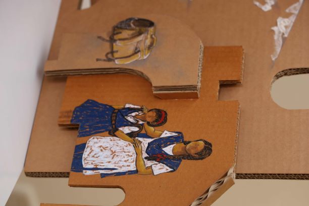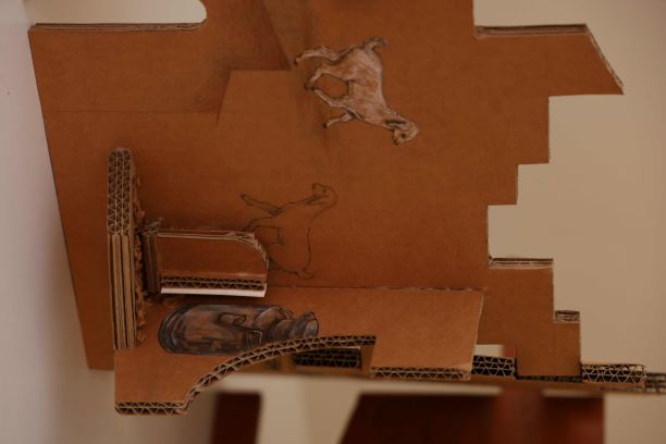 “My work reflects the tensions between rural life and urban expansion, highlighting the realities of forced migration. Through materials like cardboard, wood, and found objects, along with video documentation, I attempt to evoke the complexities of these transitions. Working closely with the Shivangaon community over two years, I aim to present not just their loss, but their lived experiences and voices.”—says Akanksha Patil.
