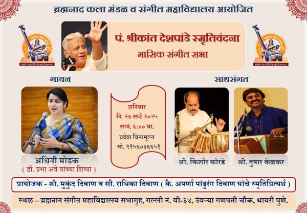 The Pandit Shrikant Deshpande Smriti Vandana Masik Sangeet Sabha, organized by Brahmanand Kala Mandal and Sangeet Mahavidyalaya, promises an evening steeped in reverence and melody.