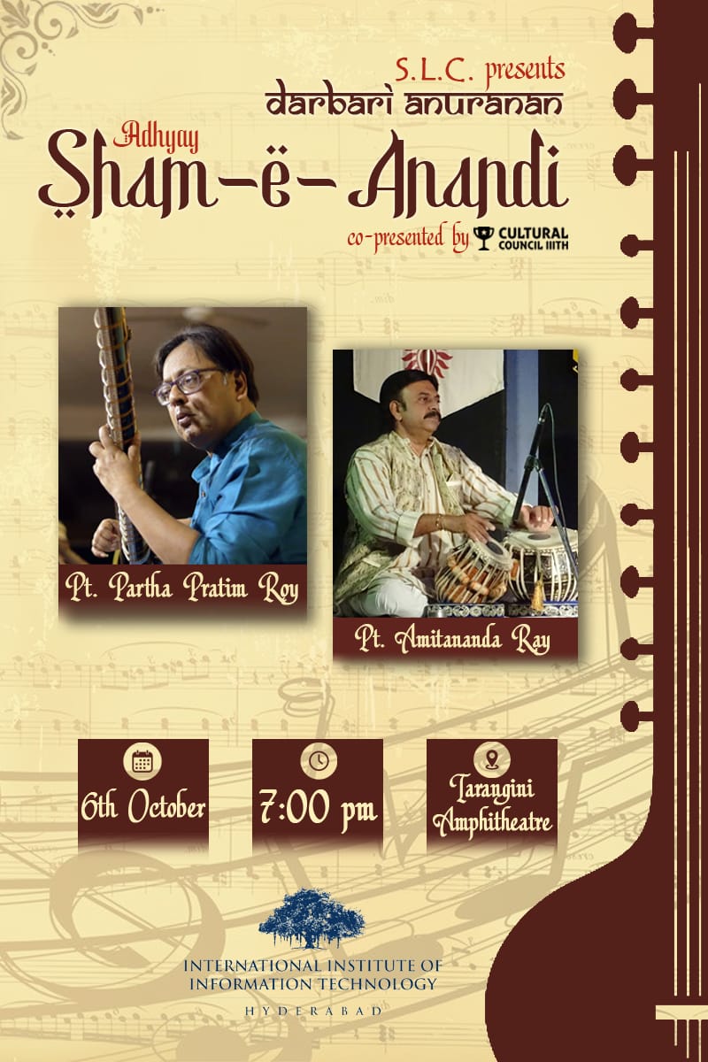 Student Life Committee (SLC), along with Cultural Council, IIIT-H presents Darbari Anuranan, Adhyay: Sham-e-Anandi – an enchanting, blissful evening of Indian classical music.