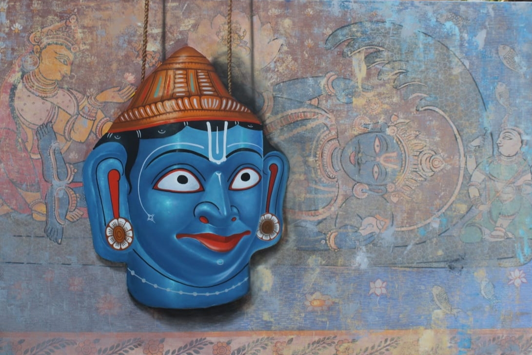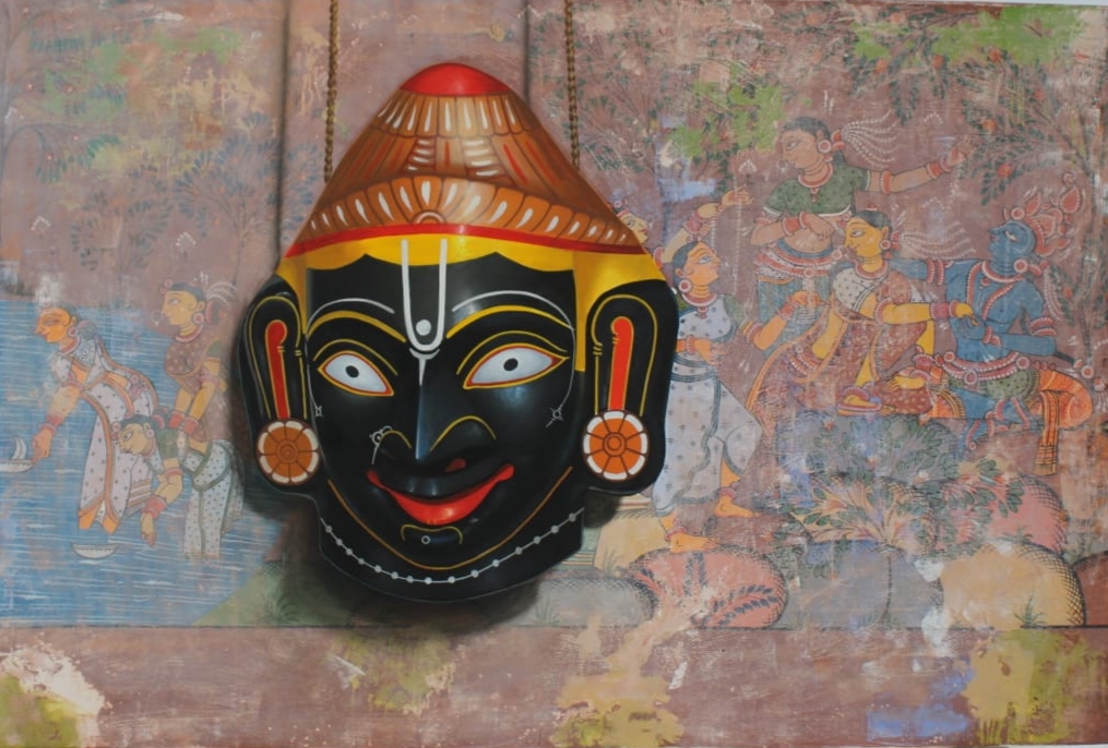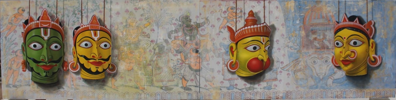 Rooted in the Jagannath culture and the artistic heritage of Raghurajpur, Mishra’s practice draws inspiration from Pattachitra, palm leaf art, mask-making and traditional performances like Puri Sahi Jata, Medha Nacha and Gotipua dance.